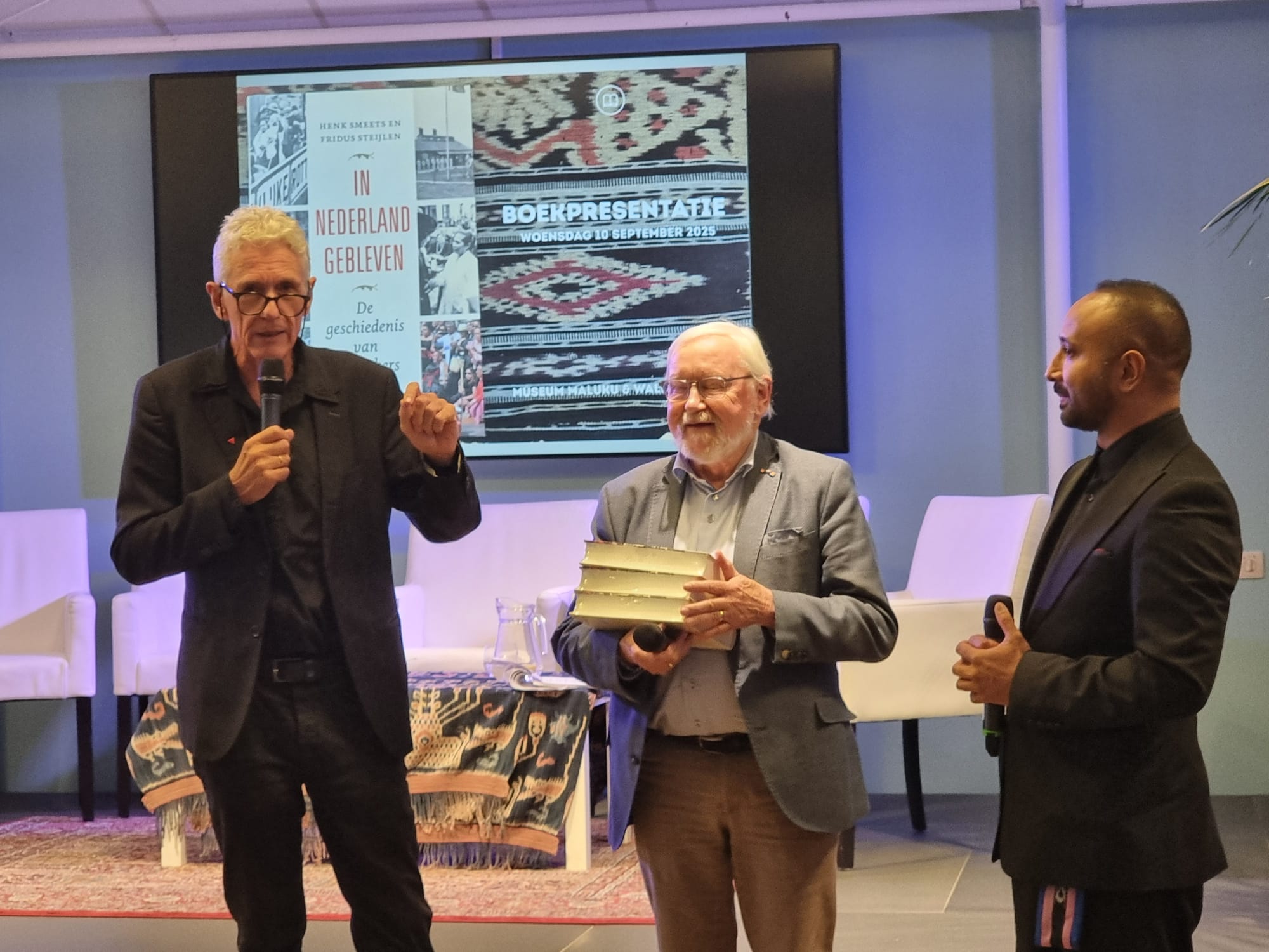 Auteurs Fridus Steijlen en Henk Smeets samen met museumdirecteur Henry Timisela tijdens de boekpresentatie in Museum Sophiahof.