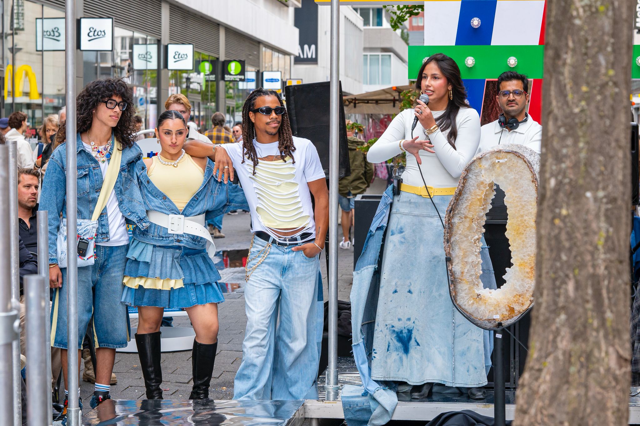 Die verbinding met de stad verwerkte ze in haar finale-outfit. “Het thema was Rotterdam, en voor mij is dat meteen streetwear. Ik wilde iets maken dat iedereen kan dragen. Denim werd de basis, want dat is tijdloos en sterk. Net als Rotterdam. Mijn vader zette een oproep op Facebook en we zijn door de stad gegaan om oude spijkerbroeken te verzamelen. Al die verhalen en materialen zitten in mijn outfits.”